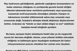 當(dāng)看到比賽名單時(shí),我才意識(shí)到這些天來的溝通毫無意義——那些在海外為國爭光的球員,在國家隊(duì)決策者眼中,其表現(xiàn)和斗志根本不被重視。為避免影響集訓(xùn)營和球隊(duì)士氣,我選擇在返回伊斯坦布爾后向技術(shù)團(tuán)隊(duì)傳達(dá)了我的想法,而非在比賽期間或賽后,隨后在‘技術(shù)和管理團(tuán)隊(duì)知情并同意’的情況下,我自愿離開了集訓(xùn)營。