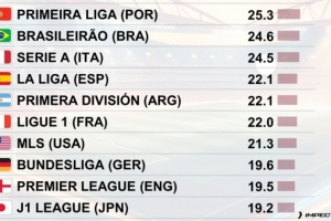 體育資訊10月13日訊 CIES足球天文臺(tái)統(tǒng)計(jì)了全球聯(lián)賽每90分鐘犯規(guī)情況,其中葡超以25.3次犯規(guī)位居榜首,巴甲則以24.6位居次席。