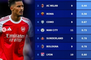 體育資訊10月21日訊 德轉盤點了五大聯賽球隊本賽季至今場均最少失球榜單(各項賽事),其中阿森納場均丟0.27球最少,具體如下:
