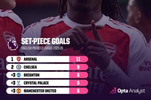 本賽季英超球隊(duì)通過(guò)定位球破門(mén)球隊(duì)排行榜↓