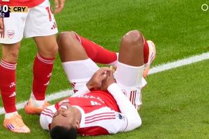 比賽第68分鐘,加布里埃爾爭頂后襠部直直撞向立柱。