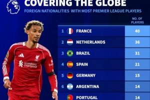 體育資訊10月27日訊 《轉會市場》統計了當前英超的各國外援數量,法國球員多達40人。