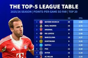 體育資訊11月08日訊 德轉統計了新賽季至今五大聯賽球隊的場均積分榜,其中拜仁全勝場均3分排在榜首,皇馬、阿森納分列二三。