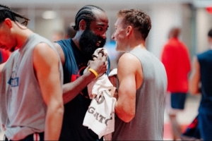 體育資訊10月2日訊 今天,快船官方曬出了球隊(duì)訓(xùn)練營第二天的照片,哈登和博格丹喜笑顏開。